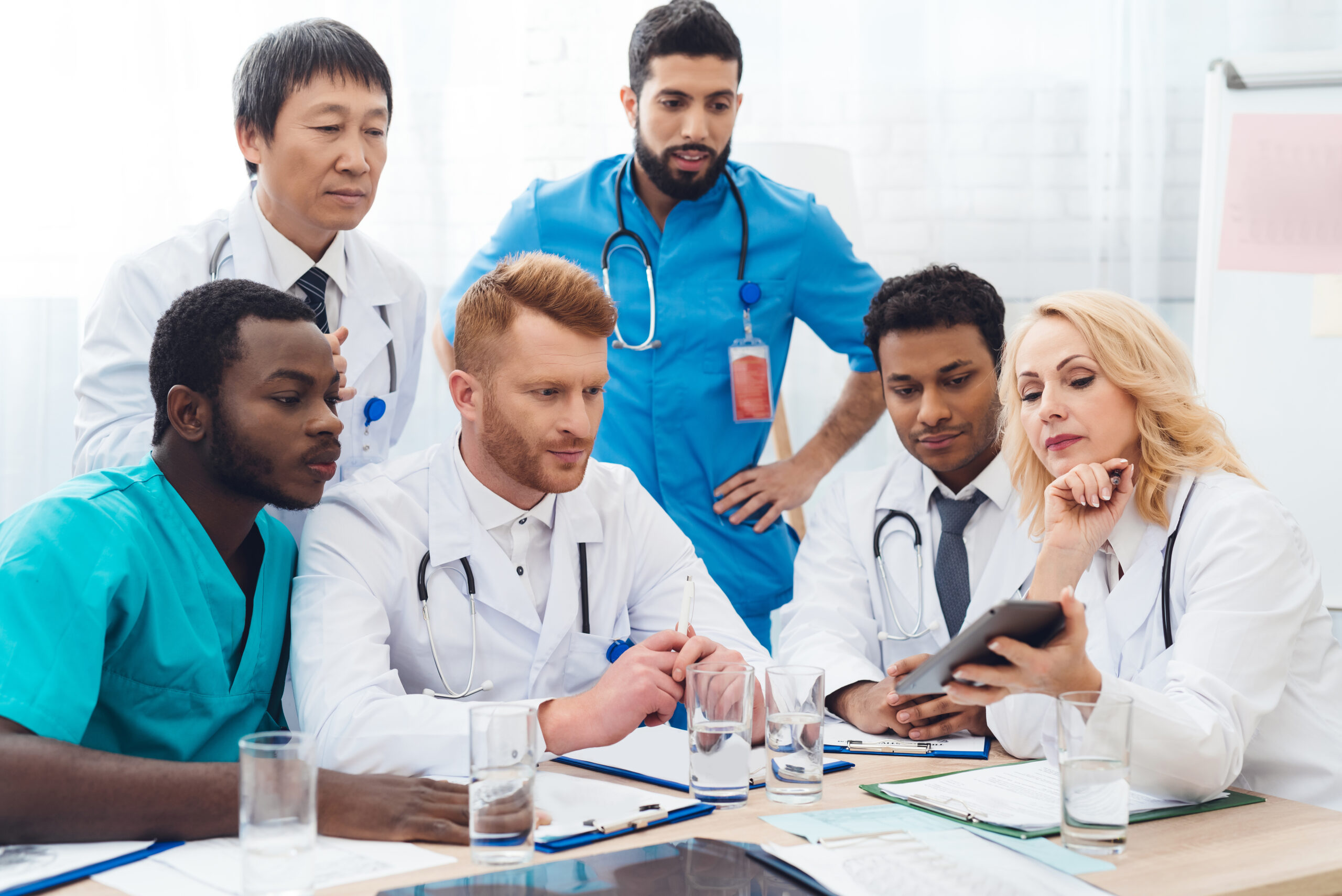 Previous ImageNext ImageSix doctors from different countries are examining something Six doctors from different countries are examining something